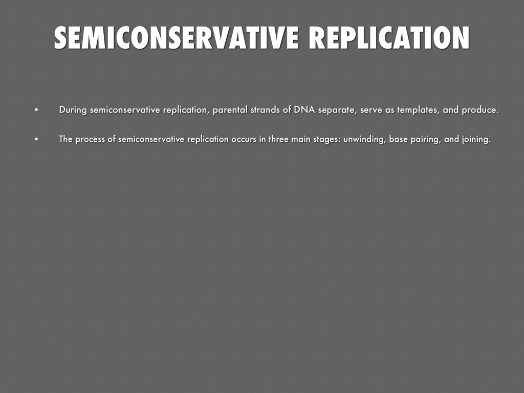 The process of semiconservative replication occurs in three main stages: unwinding, base pairing, and joining.