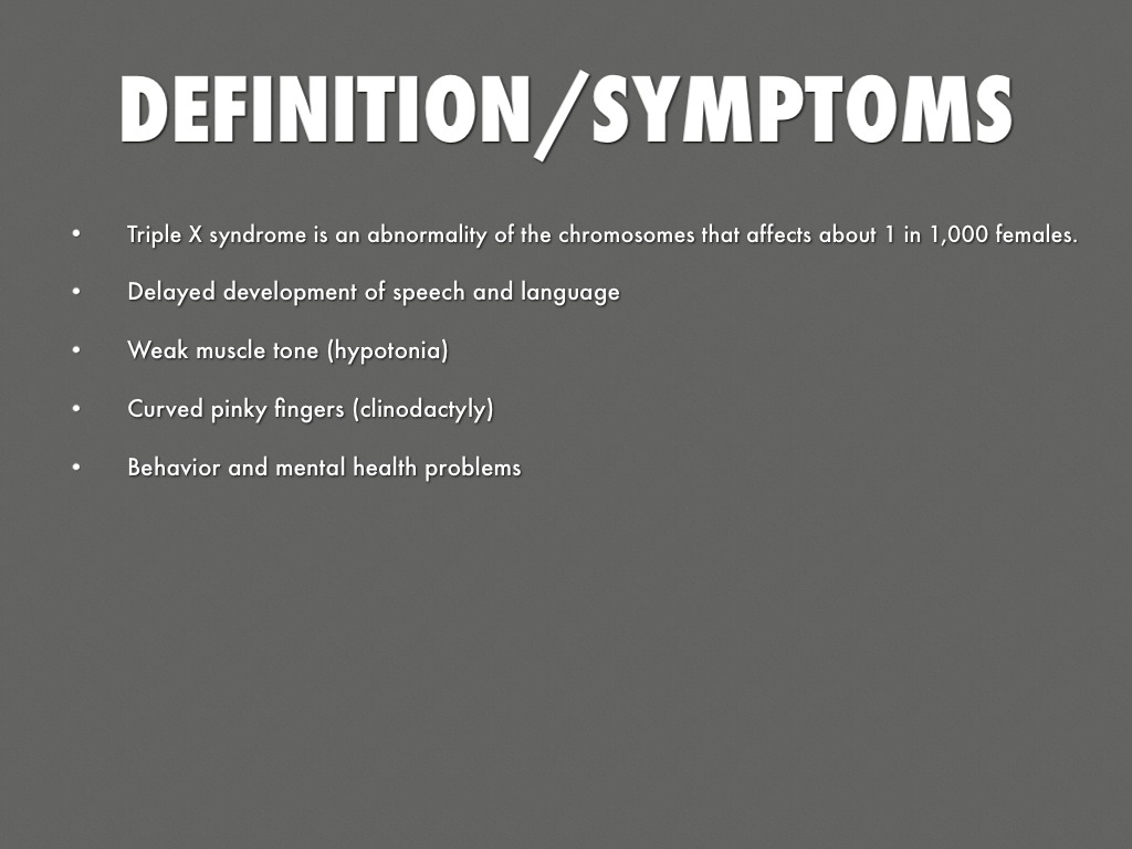 Triple X syndrome is an abnormality of the chromosomes that affects about 1 in 1,000 females.
