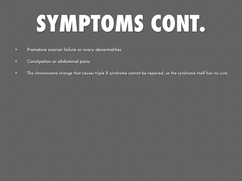 • The chromosome change that causes triple X syndrome cannot be repaired, so the syndrome itself has no cure.