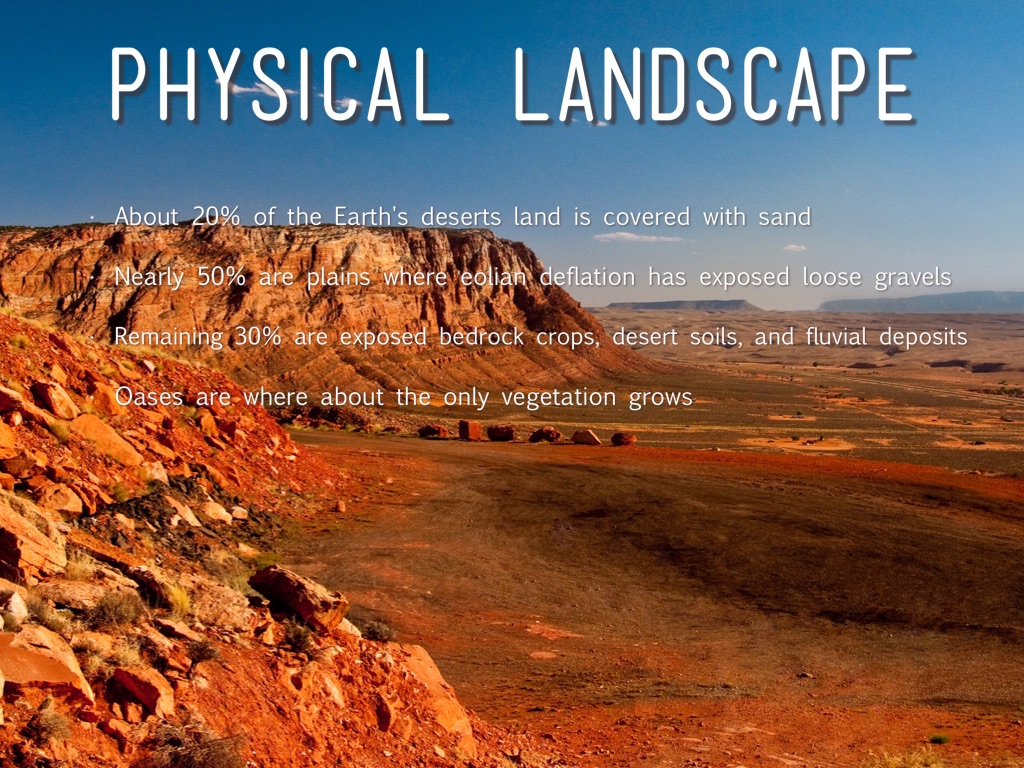 Remaining 30% are exposed bedrock crops, desert soils, and fluvial deposits