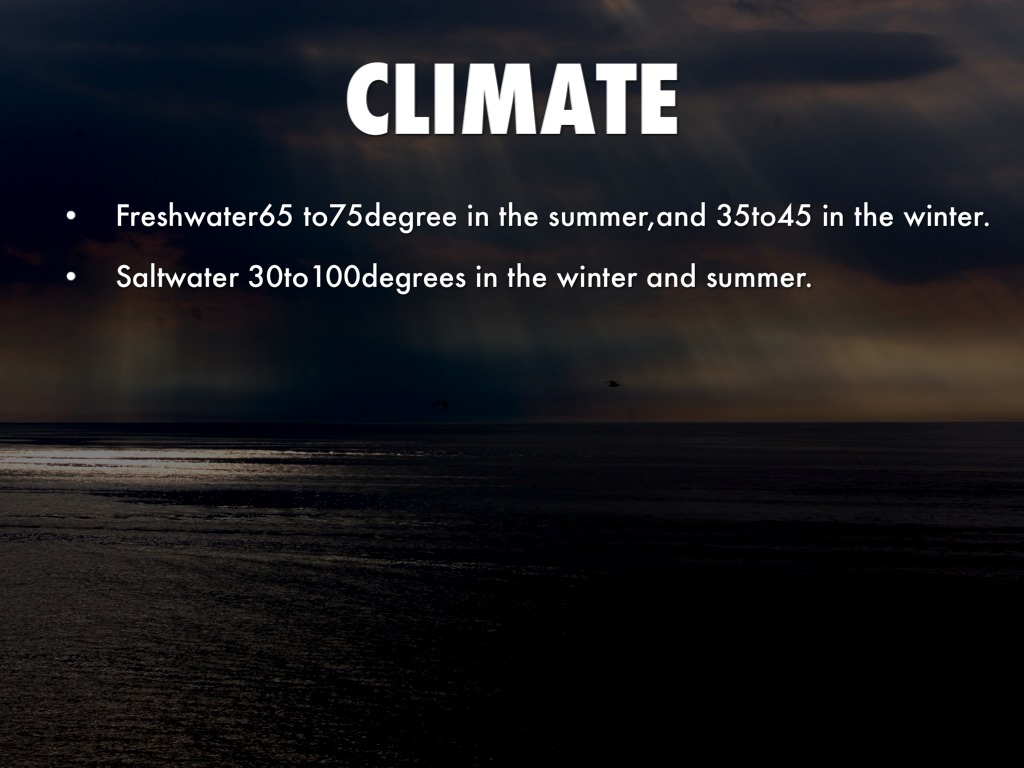 Freshwater65 to75degree in the summer,and 35to45 in the winter.