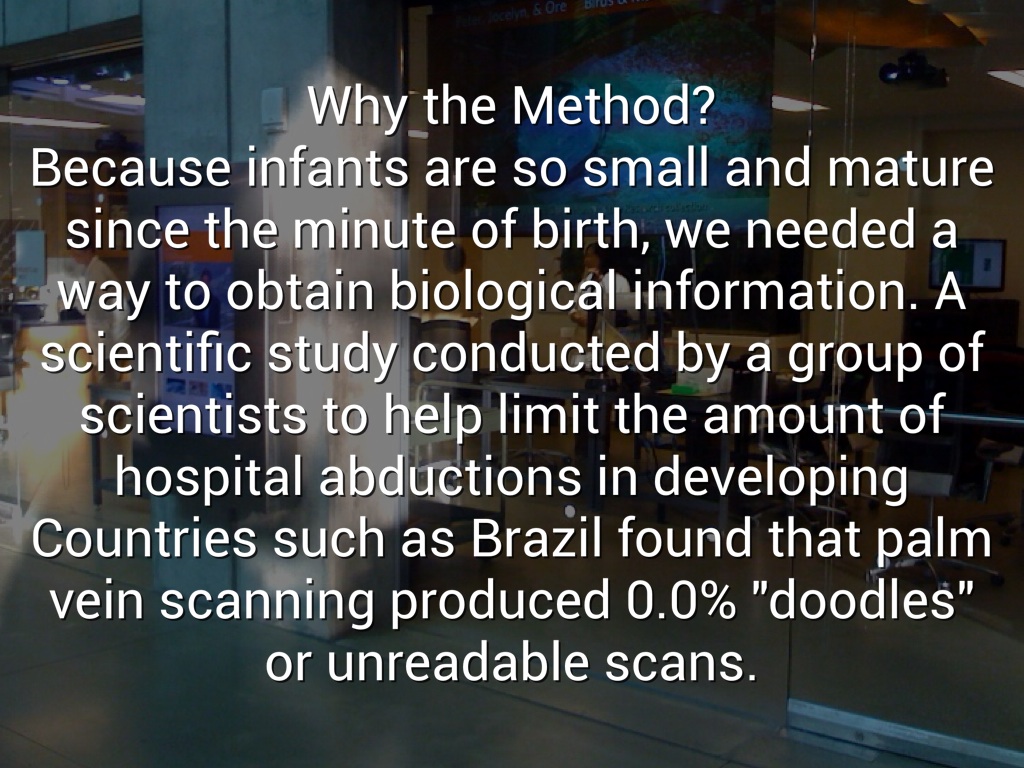 Why the Method? Because infants are so small and mature since the minute of birth, we needed a way to obtain biological information. A scientific study conducted by a group of scientists to help limit the amount of hospital abductions in developing Countries such as Brazil found that palm vein scanning produced 0.0% "doodles" or unreadable scans.