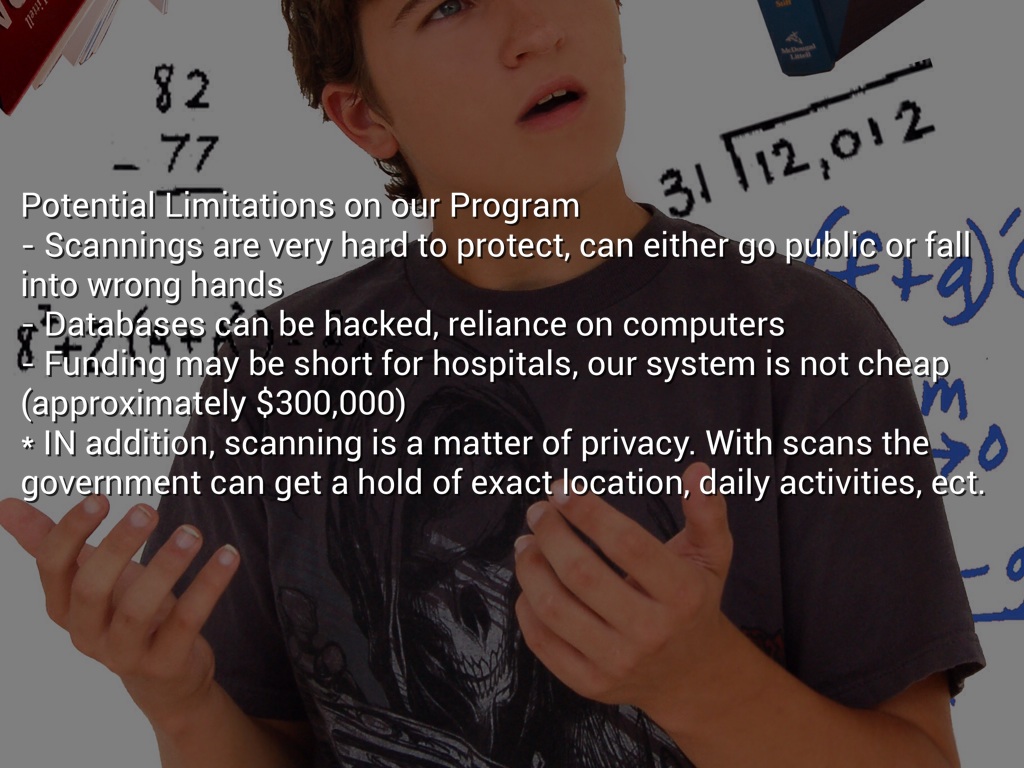 Potential Limitations on our Program - Scannings are very hard to protect, can either go public or fall into wrong hands - Databases can be hacked, reliance on computers - Funding may be short for hospitals, our system is not cheap (approximately $300,000) * IN addition, scanning is a matter of privacy. With scans the government can get a hold of exact location, daily activities, ect.