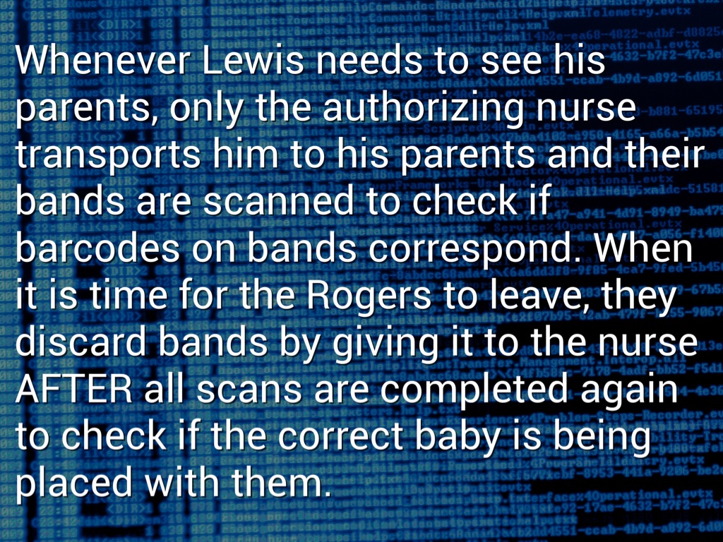 Whenever Lewis needs to see his parents, only the authorizing nurse transports him to his parents and their bands are scanned to check if barcodes on bands correspond. When it is time for the Rogers to leave, they discard bands by giving it to the nurse AFTER all scans are completed again to check if the correct baby is being placed with them.