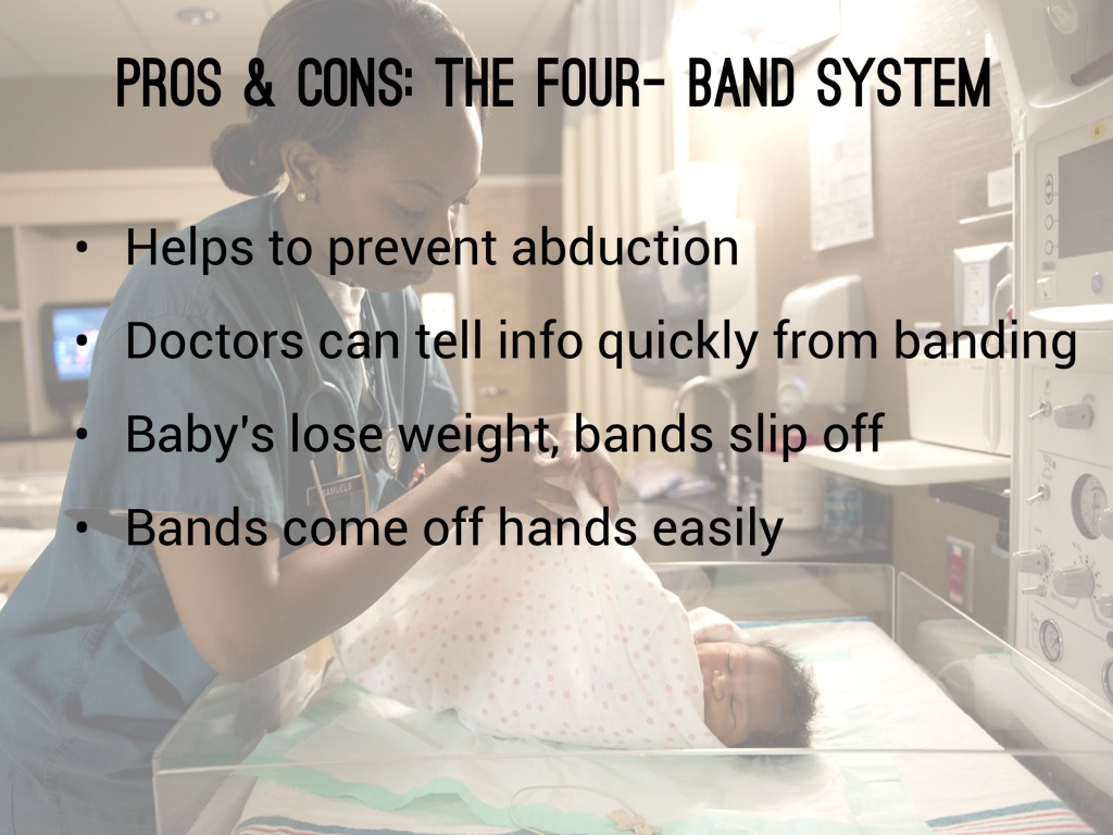 Continued... - Scanners will be check pointed at every exit, and whenever the child is moved from the nursery, the barcode will be alarmed. The parents and personnel such as nurses will contain specialized banding that prevents the alarm from sounding for necessary purposes.