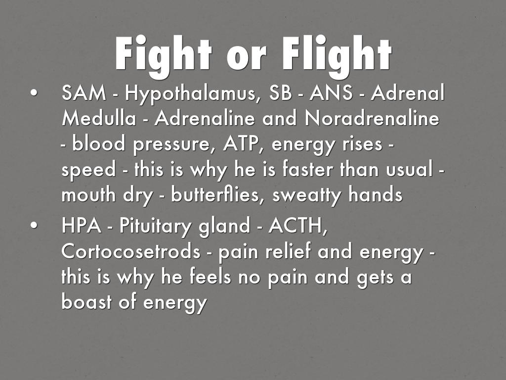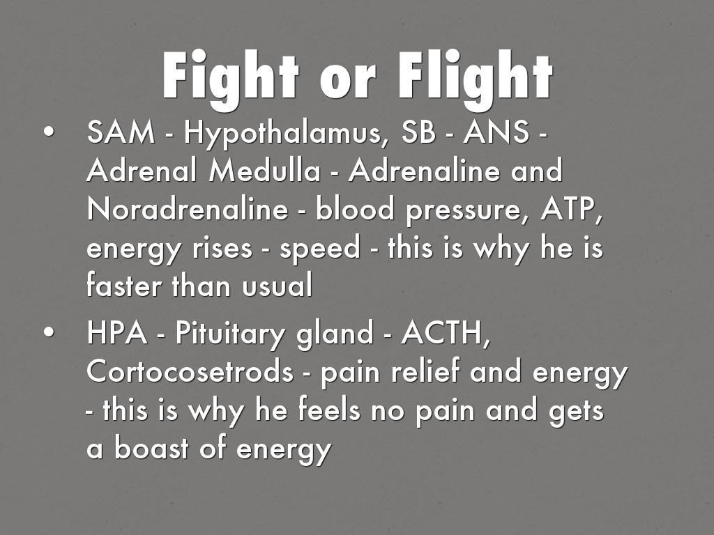SAM - Hypothalamus, SB - ANS - Adrenal Medulla - Adrenaline and Noradrenaline - blood pressure, ATP, energy rises - speed - this is why he is faster than usual