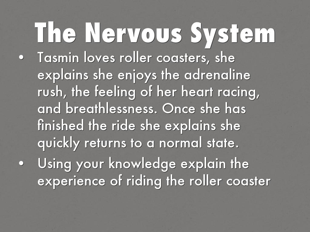 Tasmin loves roller coasters, she explains she enjoys the adrenaline rush, the feeling of her heart racing, and breathlessness. Once she has finished the ride she explains she quickly returns to a normal state.