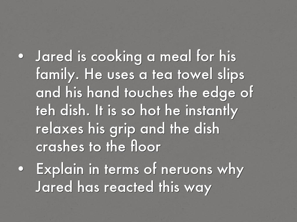 Jared is cooking a meal for his family. He uses a tea towel slips and his hand touches the edge of teh dish. It is so hot he instantly relaxes his grip and the dish crashes to the floor