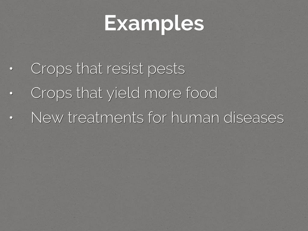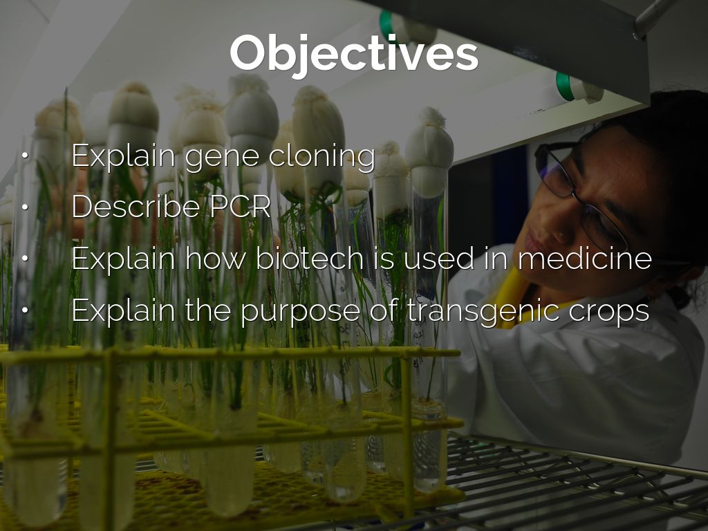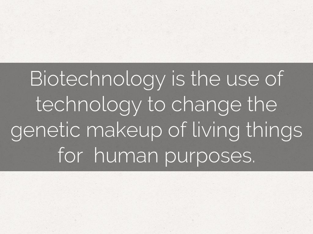 Biotechnology is the use of technology to change the genetic makeup of living things for human purposes.