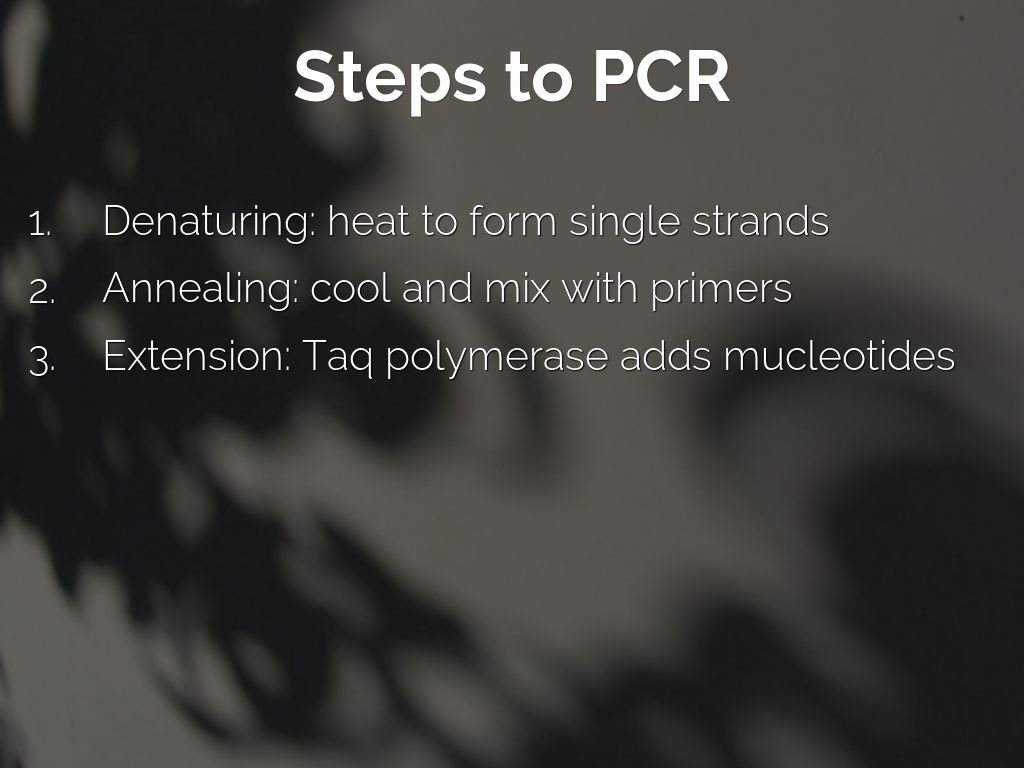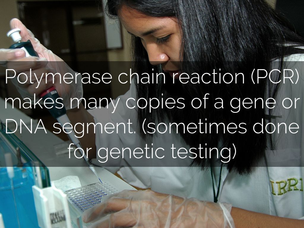 Polymerase chain reaction (PCR) makes many copies of a gene or DNA segment. (sometimes done for genetic testing)