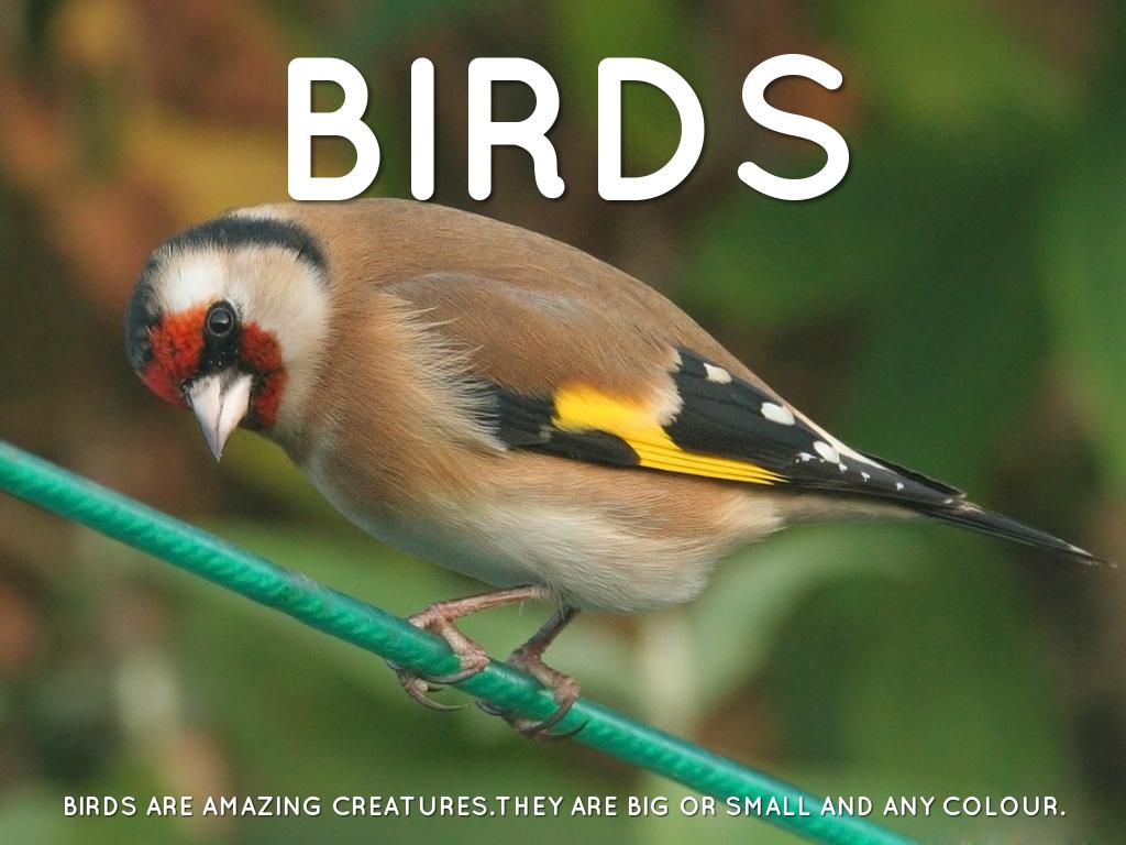 BIRDS ARE AMAZING CREATURES.THEY ARE BIG OR SMALL AND ANY COLOUR.