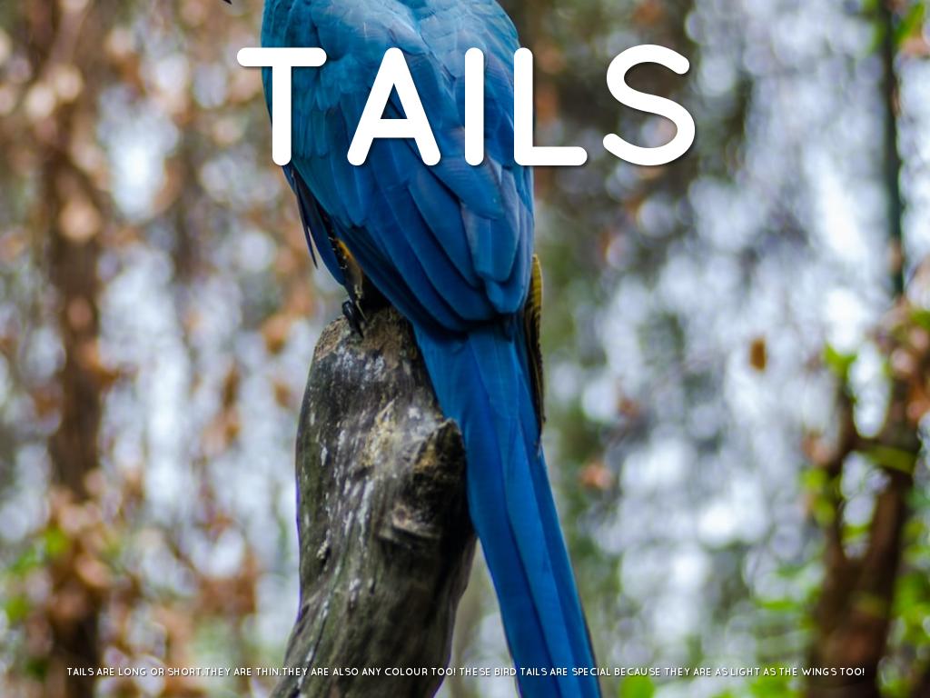 TAILS ARE LONG OR SHORT.THEY ARE THIN.THEY ARE ALSO ANY COLOUR TOO! THESE BIRD TAILS ARE SPECIAL BECAUSE THEY ARE AS LIGHT AS THE WINGS TOO!