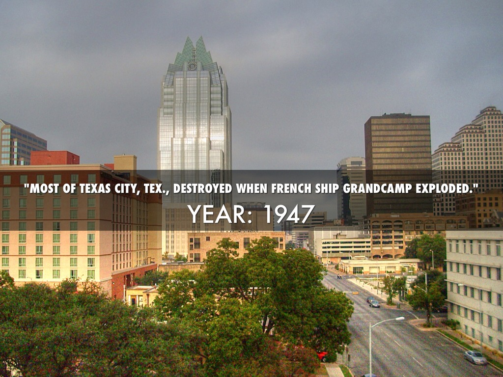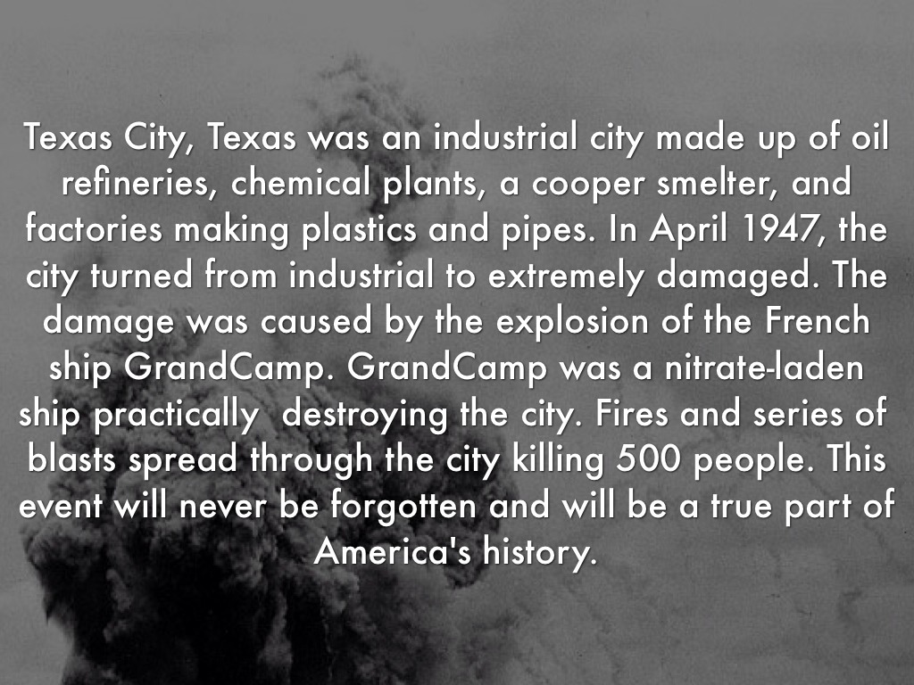 Texas City, Texas was an industrial city made up of oil refineries, chemical plants, a cooper smelter, and factories making plastics and pipes. In April 1947, the city turned from industrial to extremely damaged. The damage was caused by the explosion of the French ship GrandCamp. GrandCamp was a nitrate-laden ship practically destroying the city. Fires and series of blasts spread through the city killing 500 people. This event will never be forgotten and will be a true part of America's history.