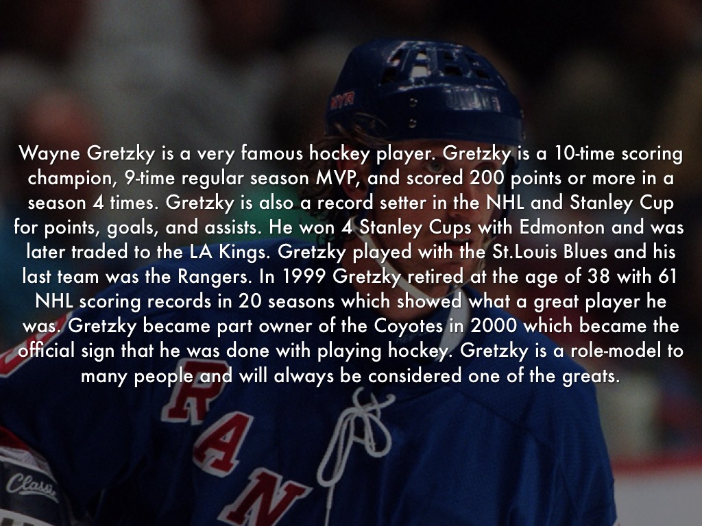 Wayne Gretzky is a very famous hockey player. Gretzky is a 10-time scoring champion, 9-time regular season MVP, and scored 200 points or more in a season 4 times. Gretzky is also a record setter in the NHL and Stanley Cup for points, goals, and assists. He won 4 Stanley Cups with Edmonton and was later traded to the LA Kings. Gretzky played with the St.Louis Blues and his last team was the Rangers. In 1999 Gretzky retired at the age of 38 with 61 NHL scoring records in 20 seasons which showed what a great player he was. Gretzky became part owner of the Coyotes in 2000 which became the official sign that he was done with playing hockey. Gretzky is a role-model to many people and will always be considered one of the greats.
