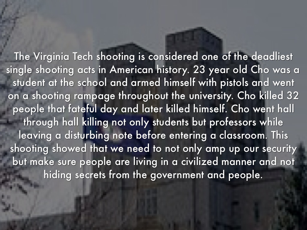 The Virginia Tech shooting is considered one of the deadliest single shooting acts in American history. 23 year old Cho was a student at the school and armed himself with pistols and went on a shooting rampage throughout the university. Cho killed 32 people that fateful day and later killed himself. Cho went hall through hall killing not only students but professors while leaving a disturbing note before entering a classroom. This shooting showed that we need to not only amp up our security but make sure people are living in a civilized manner and not hiding secrets from the government and people.