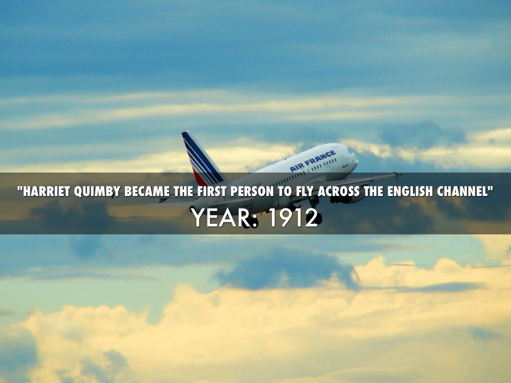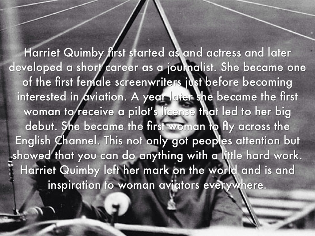 Harriet Quimby first started as and actress and later developed a short career as a journalist. She became one of the first female screenwriters just before becoming interested in aviation. A year later she became the first woman to receive a pilot's license that led to her big debut. She became the first woman to fly across the English Channel. This not only got peoples attention but showed that you can do anything with a little hard work. Harriet Quimby left her mark on the world and is and inspiration to woman aviators everywhere.