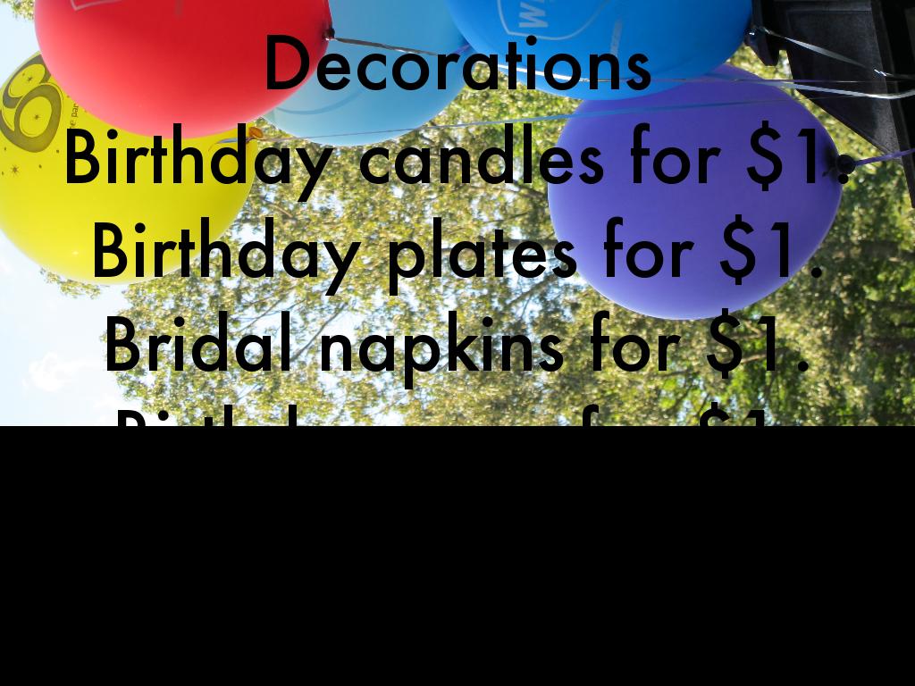 Birthday candles for $1. Birthday plates for $1. Bridal napkins for $1. Birthday cups for $1. Balloons for $1.