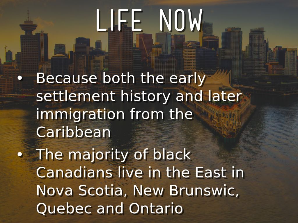 The majority of black Canadians live in the East in Nova Scotia, New Brunswic, Quebec and Ontario