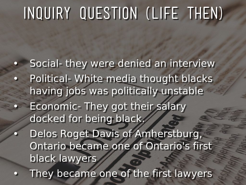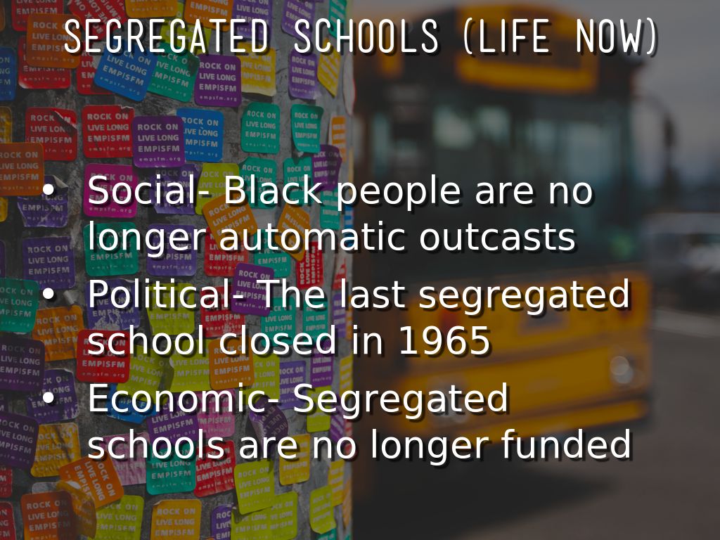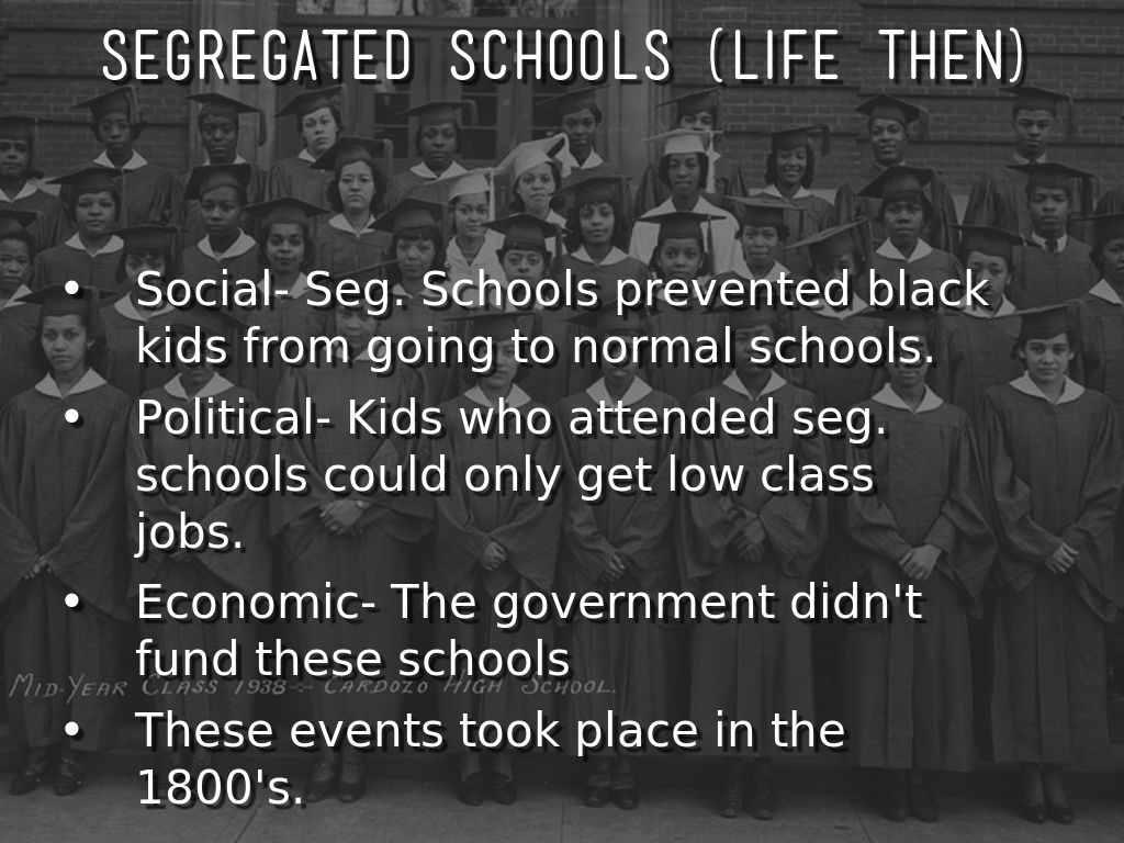 Social- Seg. Schools prevented black kids from going to normal schools.
