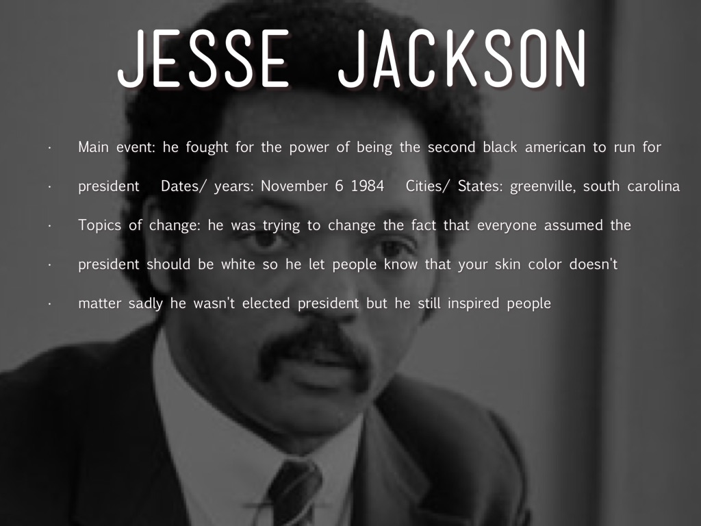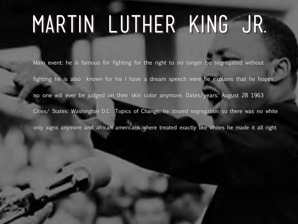 Cities/ States: Washington D.C Topics of Change: he stoped segregation so there was no white