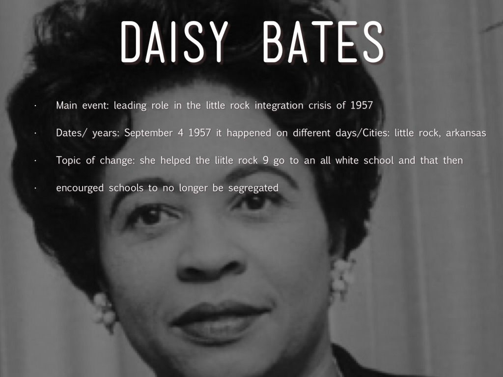 Topic of change: she helped the liitle rock 9 go to an all white school and that then