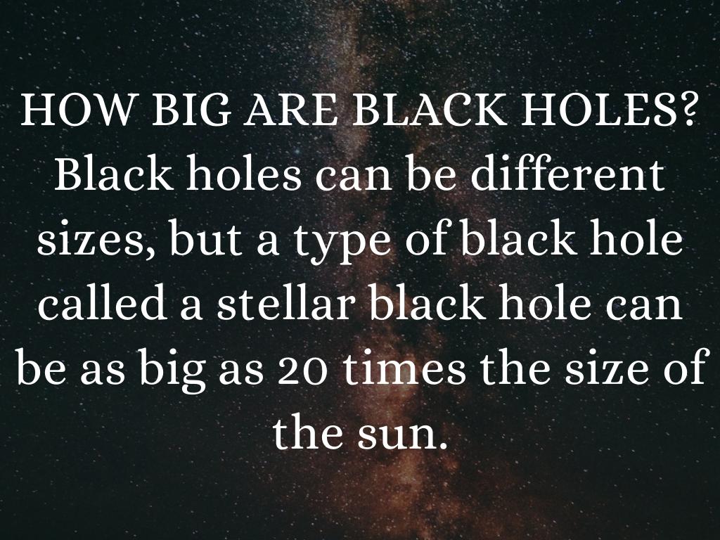 Black holes can be different sizes, but a type of black hole called a stellar black hole can be as big as 20 times the size of the sun.