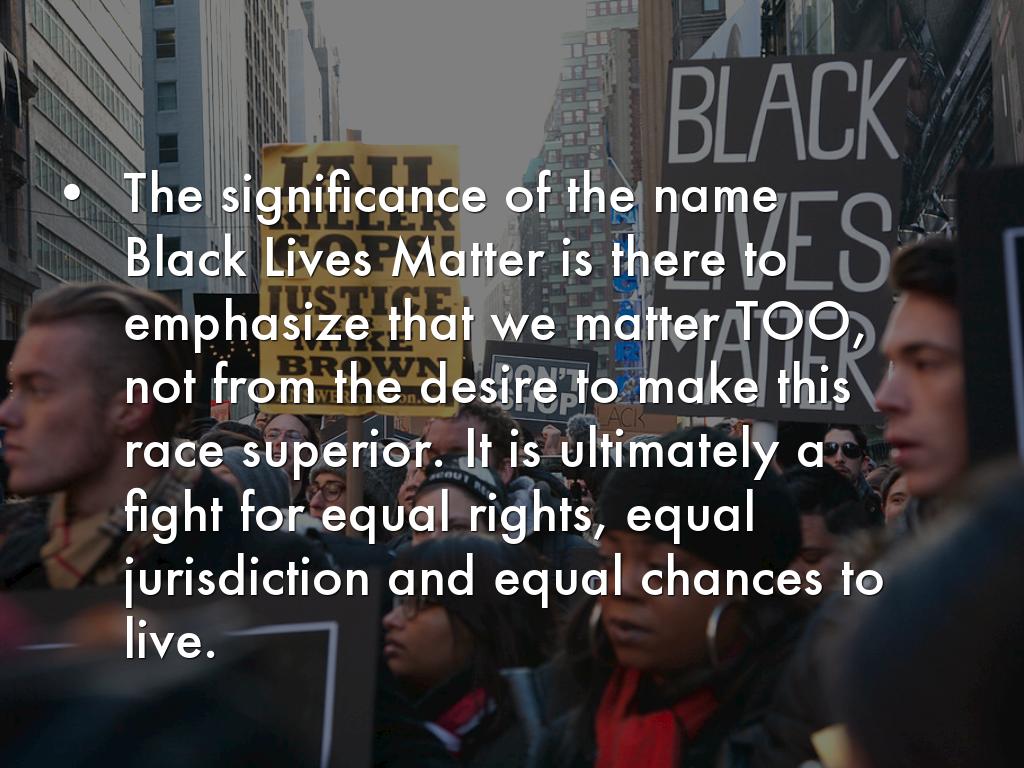 The significance of the name Black Lives Matter is there to emphasize that we matter TOO, not from the desire to make this race superior. It is ultimately a fight for equal rights, equal jurisdiction and equal chances to live.