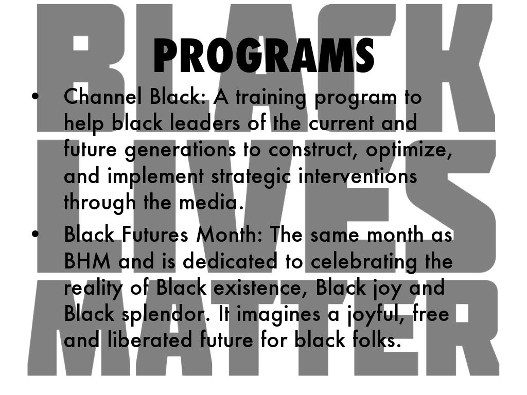 Channel Black: A training program to help black leaders of the current and future generations to construct, optimize, and implement strategic interventions through the media.