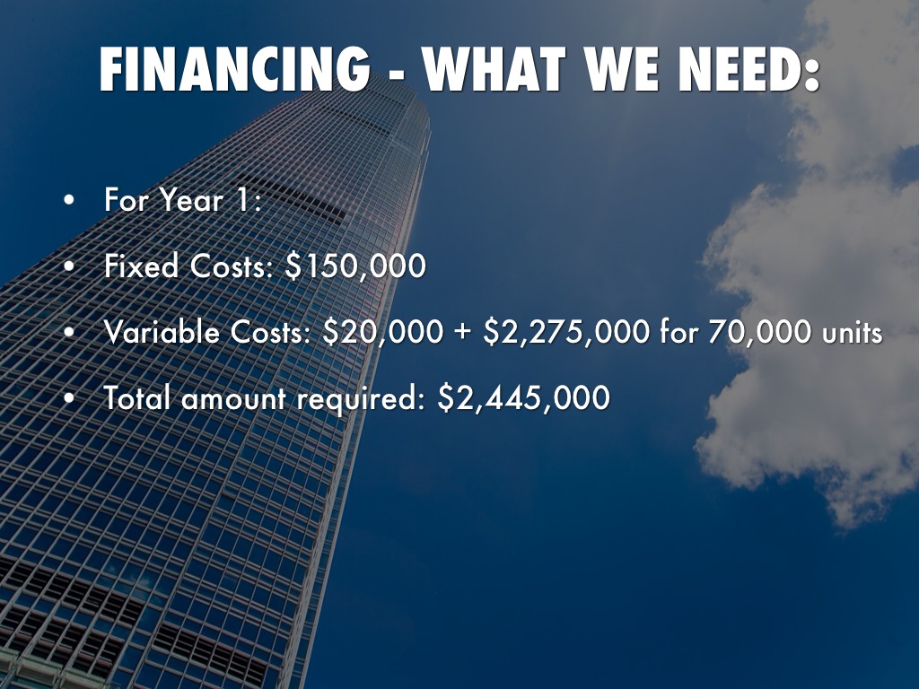 • Variable Costs: $20,000 + $2,275,000 for 70,000 units