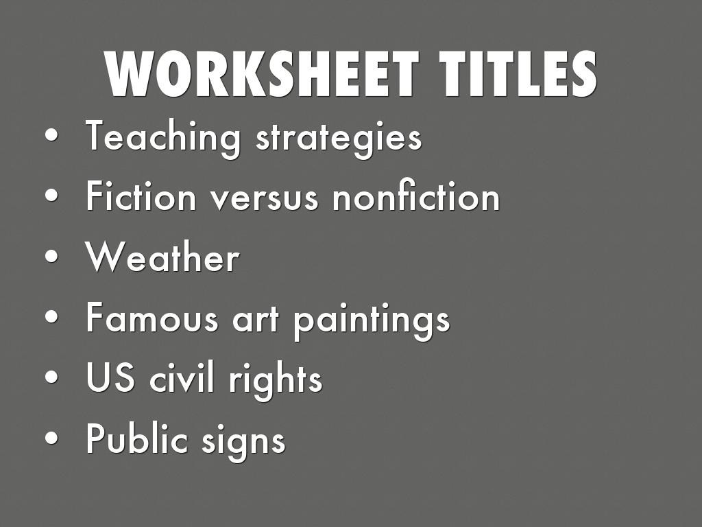 This slide show introduces our "Blindness Teaching Strategies with Braille and K - 5th Grade Worksheets." The subjects covered include Famous Art, Geometry, Measurement and Data, Weather, U.S. Civil Rights, ADA Compliant Public Signs, Wendy the Witch - Halloween and Fiction vs. Non-Fiction Characters.