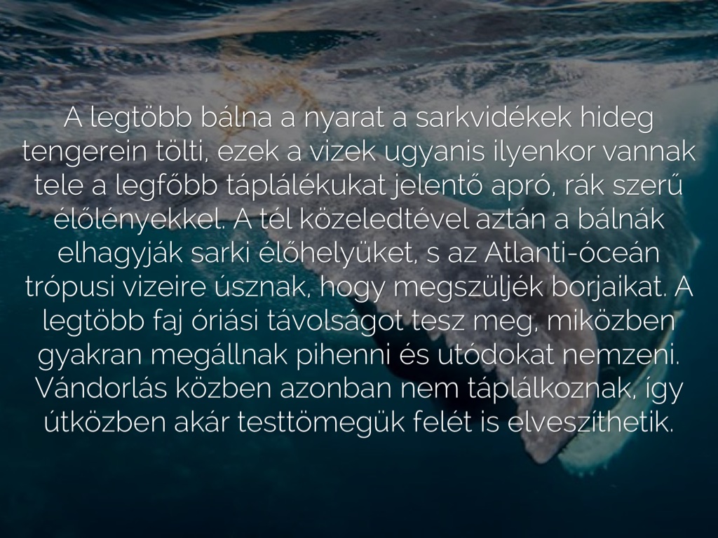 A legtöbb bálna a nyarat a sarkvidékek hideg tengerein tölti, ezek a vizek ugyanis ilyenkor vannak tele a legfőbb táplálékukat jelentő apró, rák szerű élőlényekkel. A tél közeledtével aztán a bálnák elhagyják sarki élőhelyüket, s az Atlanti-óceán trópusi vizeire úsznak, hogy megszüljék borjaikat. A legtöbb faj óriási távolságot tesz meg, miközben gyakran megállnak pihenni és utódokat nemzeni. Vándorlás közben azonban nem táplálkoznak, így útközben akár testtömegük felét is elveszíthetik.