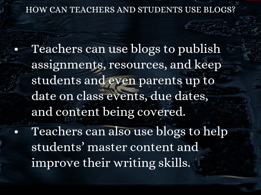 Teachers can use blogs to publish assignments, resources, and keep students and even parents up to date on class events, due dates, and content being covered.