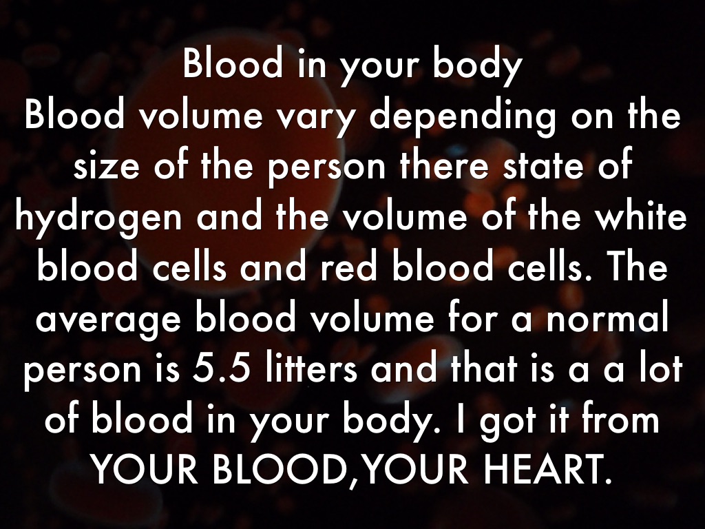 Blood in your body Blood volume vary depending on the size of the person there state of hydrogen and the volume of the white blood cells and red blood cells. The average blood volume for a normal person is 5.5 litters and that is a a lot of blood in your body. I got it from YOUR BLOOD,YOUR HEART.