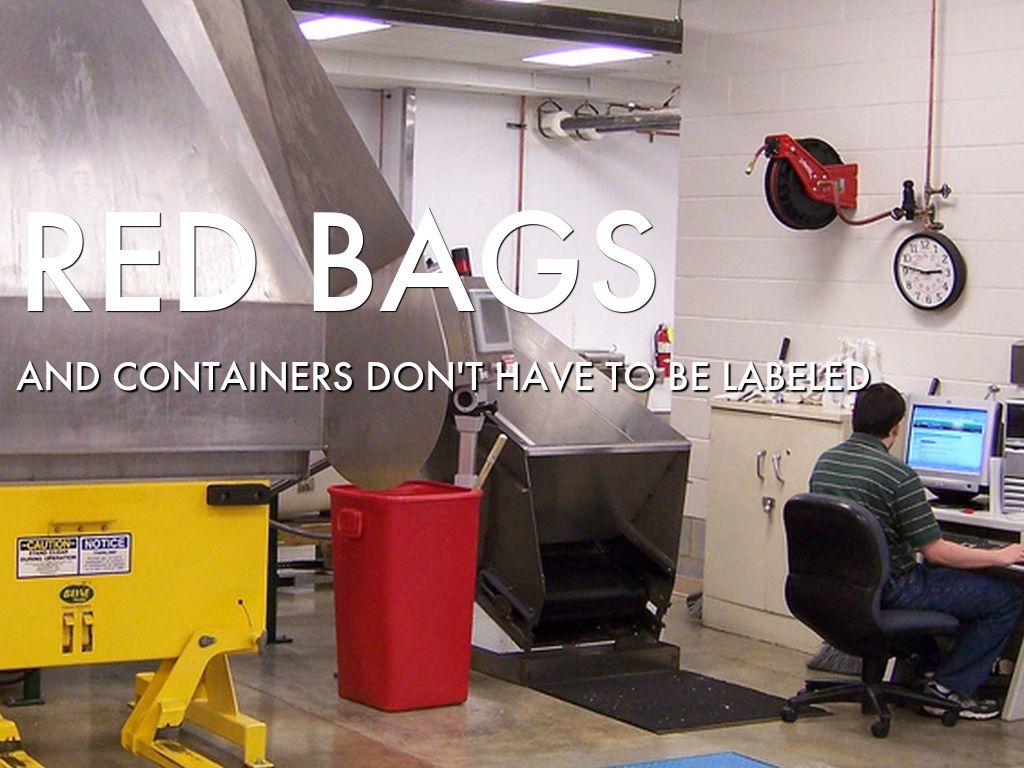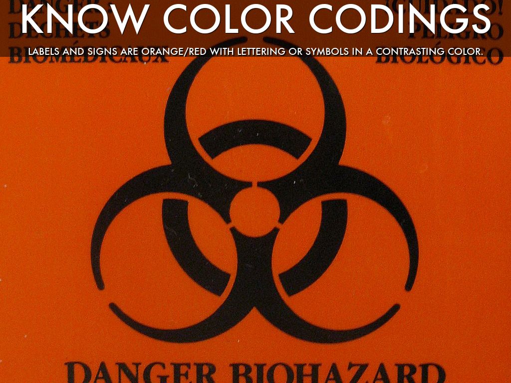 Labels and signs are orange/red with lettering or symbols in a contrasting color.