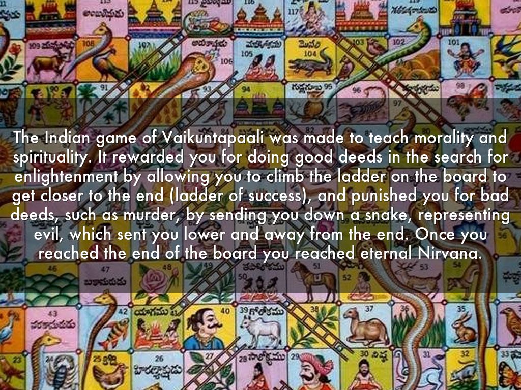 The Indian game of Vaikuntapaali was made to teach morality and spirituality. It rewarded you for doing good deeds in the search for enlightenment by allowing you to climb the ladder on the board to get closer to the end (ladder of success), and punished you for bad deeds, such as murder, by sending you down a snake, representing evil, which sent you lower and away from the end. Once you reached the end of the board you reached eternal Nirvana.