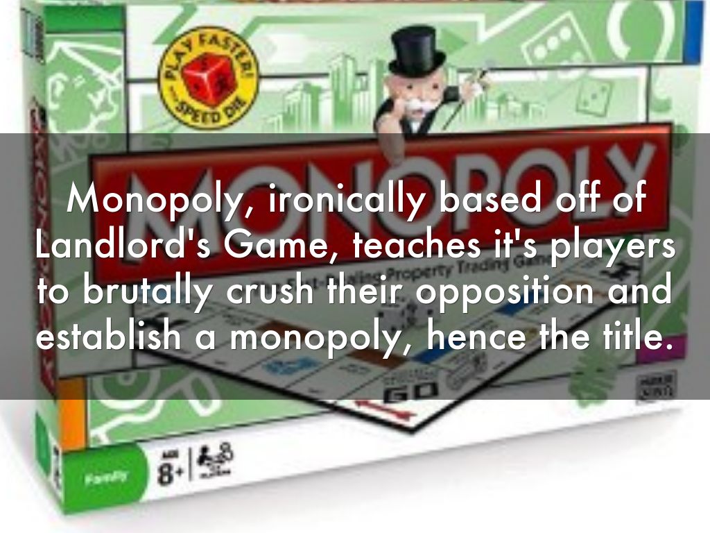 Monopoly, ironically based off of Landlord's Game, teaches it's players to brutally crush their opposition and establish a monopoly, hence the title.