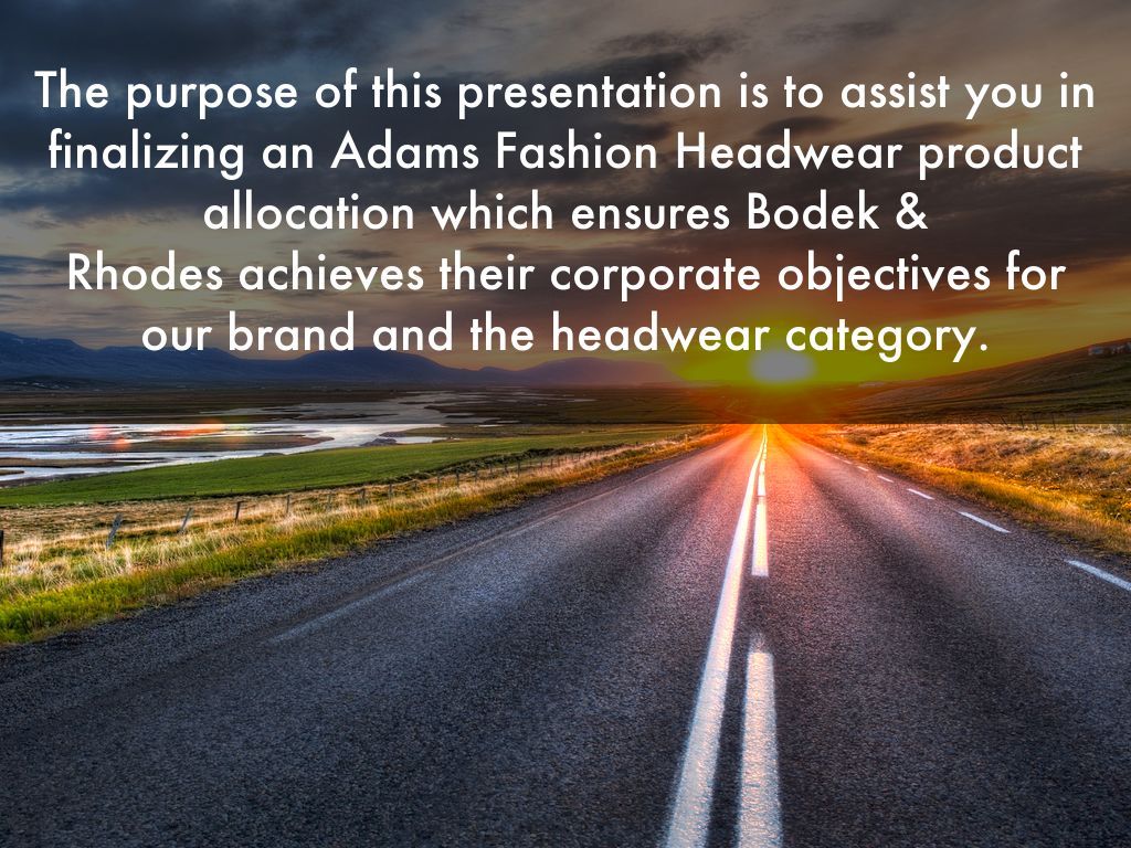 The purpose of this presentation is to assist you in finalizing an Adams Fashion Headwear product allocation which ensures Bodek &