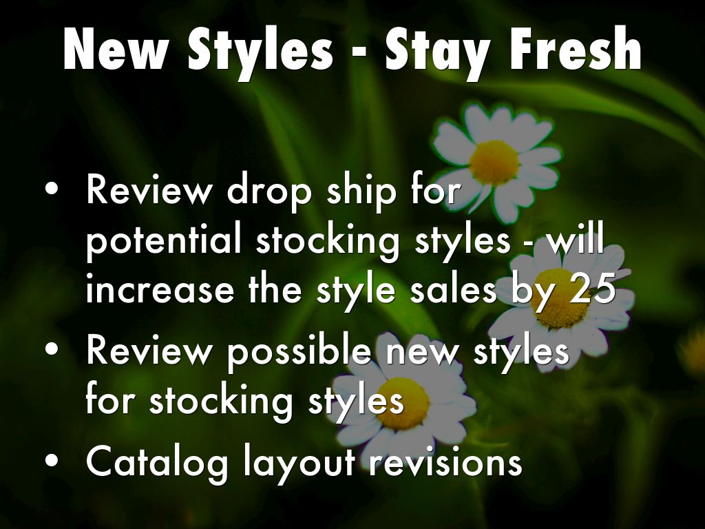 - Review drop ship for potential stocking styles - will increase the style sales by 25