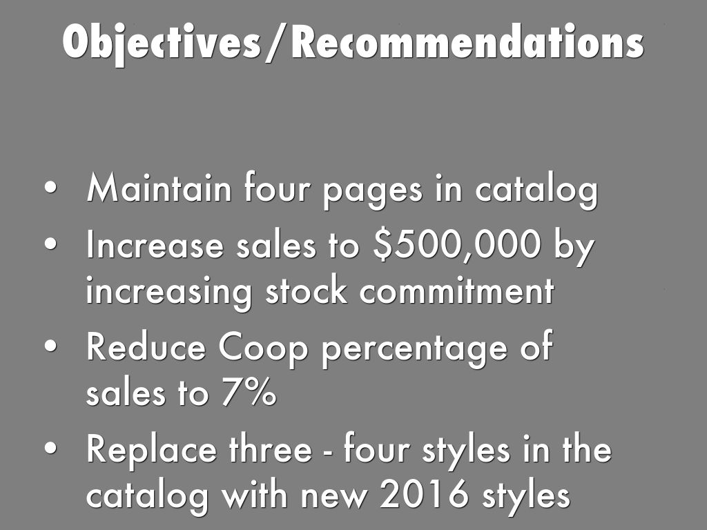 - Replace three - four styles in the catalog with new 2016 styles