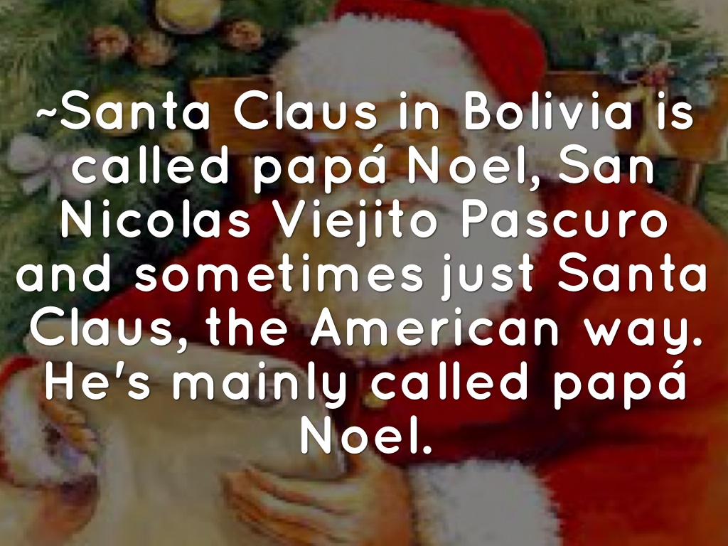 ~Santa Claus in Bolivia is called papá Noel, San Nicolas Viejito Pascuro and sometimes just Santa Claus, the American way. He's mainly called papá Noel.
