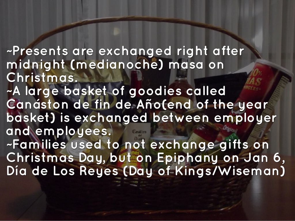 ~A large basket of goodies called Canáston de fin de Año(end of the year basket) is exchanged between employer and employees.