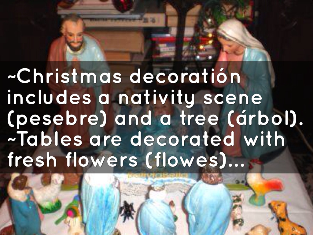 ~Christmas decoratión includes a nativity scene (pesebre) and a tree (árbol).