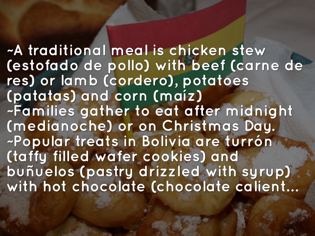 ~Popular treats in Bolivia are turrón (taffy filled wafer cookies) and buñuelos (pastry drizzled with syrup) with hot chocolate (chocolate caliente).