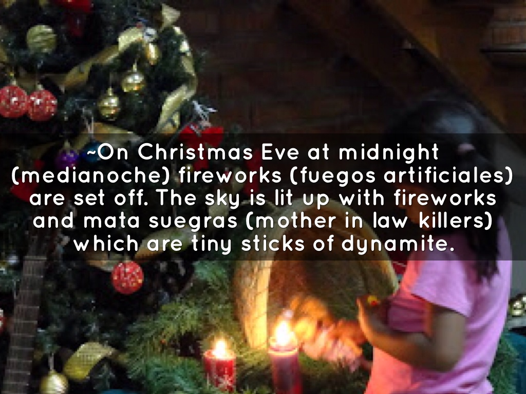 ~On Christmas Eve at midnight (medianoche) fireworks (fuegos artificiales) are set off. The sky is lit up with fireworks and mata suegras (mother in law killers) which are tiny sticks of dynamite.