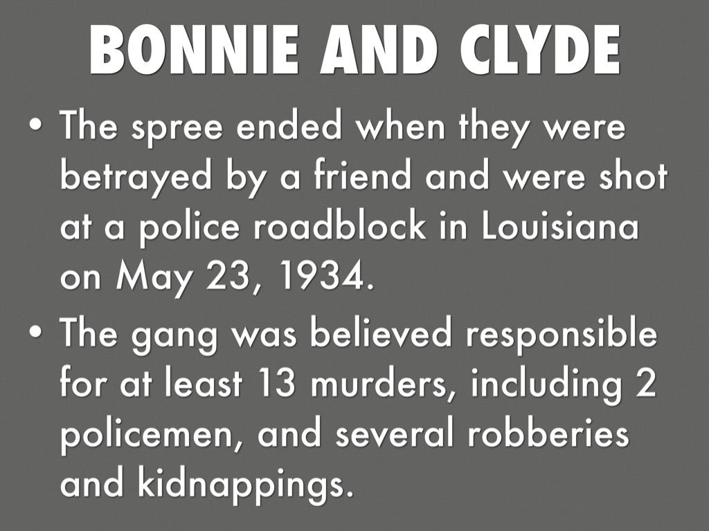 The spree ended when they were betrayed by a friend and were shot at a police roadblock in Louisiana on May 23, 1934.