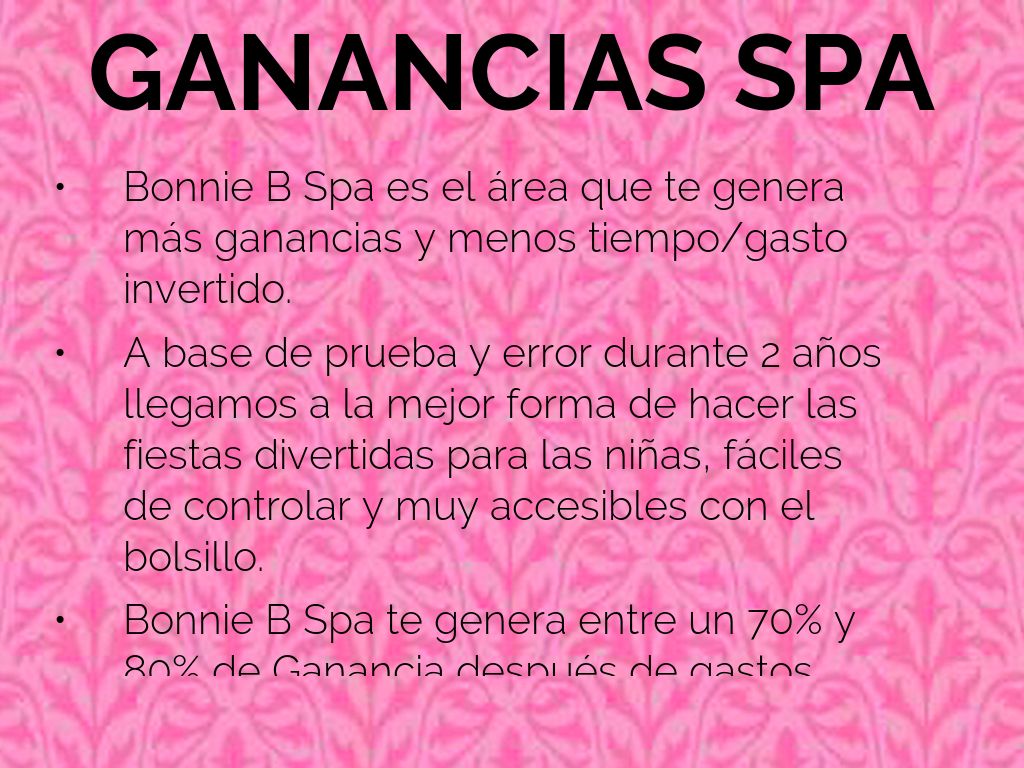 Bonnie B Spa te genera entre un 70% y 80% de Ganancia después de gastos.