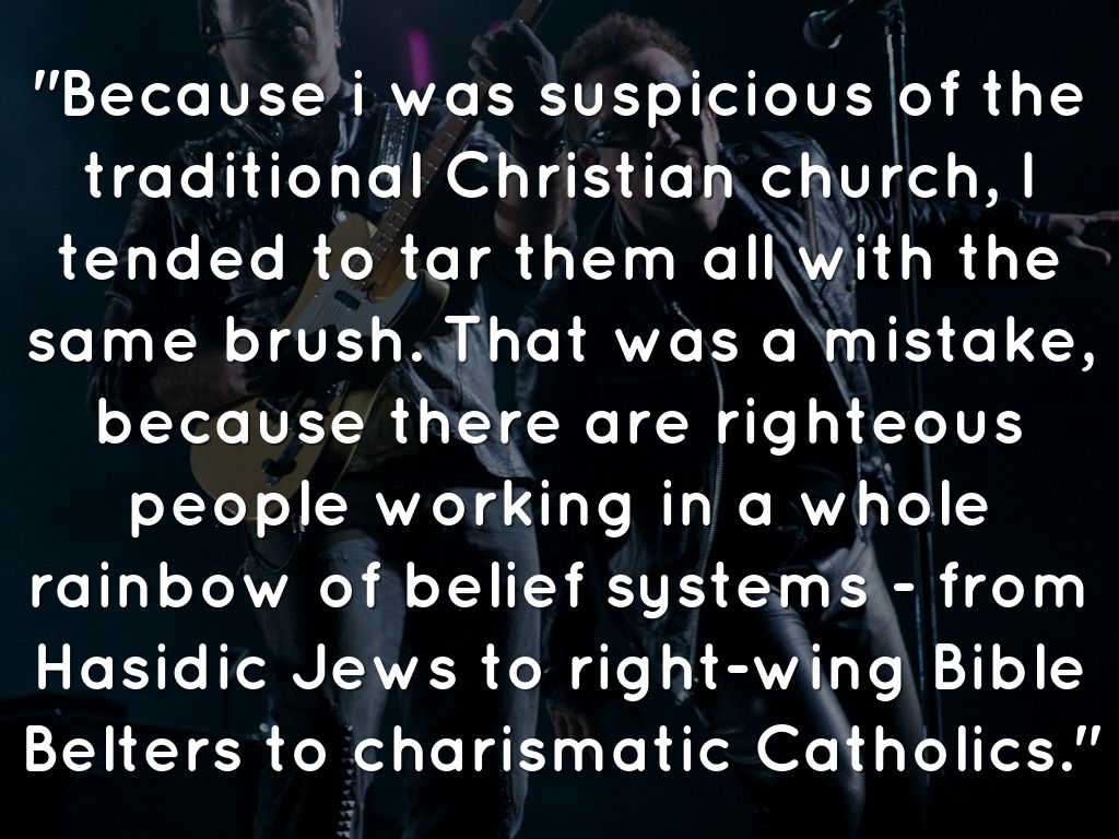 "Because i was suspicious of the traditional Christian church, I tended to tar them all with the same brush. That was a mistake, because there are righteous people working in a whole rainbow of belief systems - from Hasidic Jews to right-wing Bible Belters to charismatic Catholics."