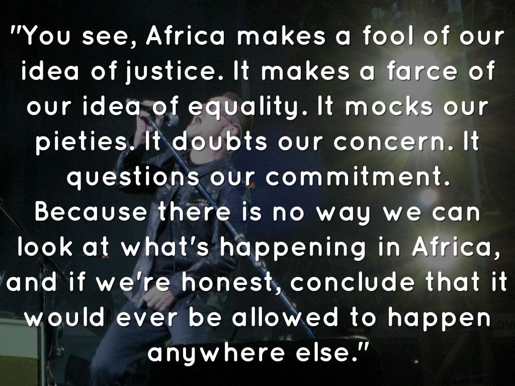 "You see, Africa makes a fool of our idea of justice. It makes a farce of our idea of equality. It mocks our pieties. It doubts our concern. It questions our commitment. Because there is no way we can look at what's happening in Africa, and if we're honest, conclude that it would ever be allowed to happen anywhere else."
