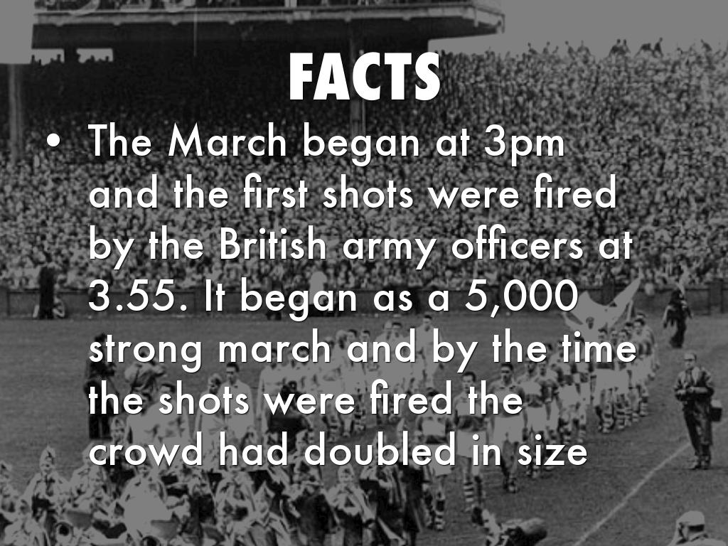 • The March began at 3pm and the first shots were fired by the British army officers at 3.55. It began as a 5,000 strong march and by the time the shots were fired the crowd had doubled in size