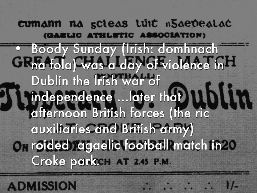 • Boody Sunday (Irish: domhnach na fola) was a day of violence in Dublin the lrish war of independence …later that afternoon British forces (the ric auxiliaries and British army) roided agaelic football match in Croke park.